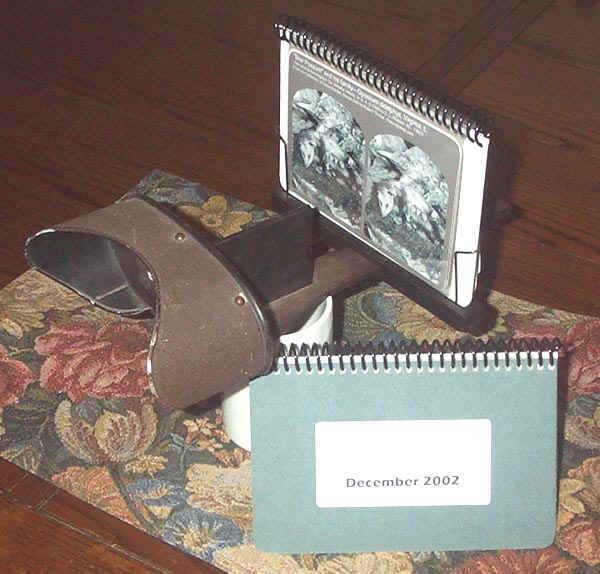 A flipbook is a handy and inexpensive way to store, protect, organize, and view digital stereoviews. It is designed in such a way that the covers themselves are inserted into the stereoscope. Two views are inserted in each protective sleeve, one facing front, the other facing back. You insert the back cover into the stereoscope and flip through the pages. When you get to the last page, you turn the book around, insert the front cover into the stereoscope, and flip through the views the other way till you get back to the beginning.